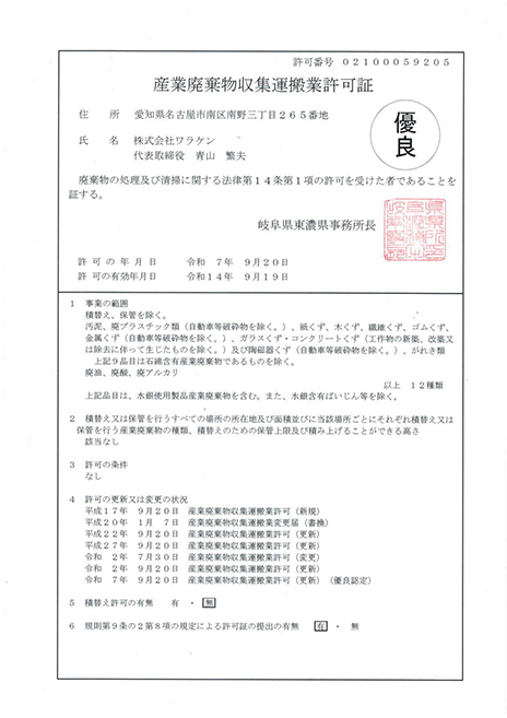●(岐阜県)産業廃棄物収集運搬業許可証